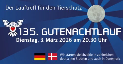 Am Dienstag, den 03. März 2026, startet, wie an jedem Vollmondabend, der Gutenachtlauf in vielen Städten in ganz Deutschland. Hier wird nicht nur gelaufen, sondern auch durch eine kleine Spende von jedem/r Laufenden Geld gesammelt. Dies wird von uns an verschiedene Tierschutzorganisationen und Lebenshöfe weitergegeben.